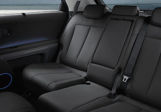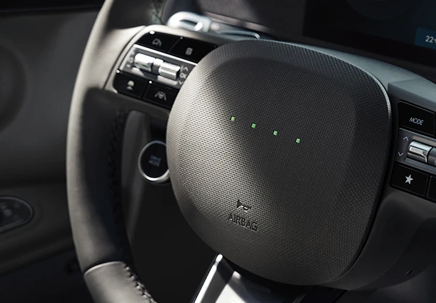 O IONIQ 5 oferece segurança completa com 7 airbags, incluindo frontais, laterais e um na lateral central do banco do motorista para reduzir lesões na cabeça causadas por colisões com passageiros.